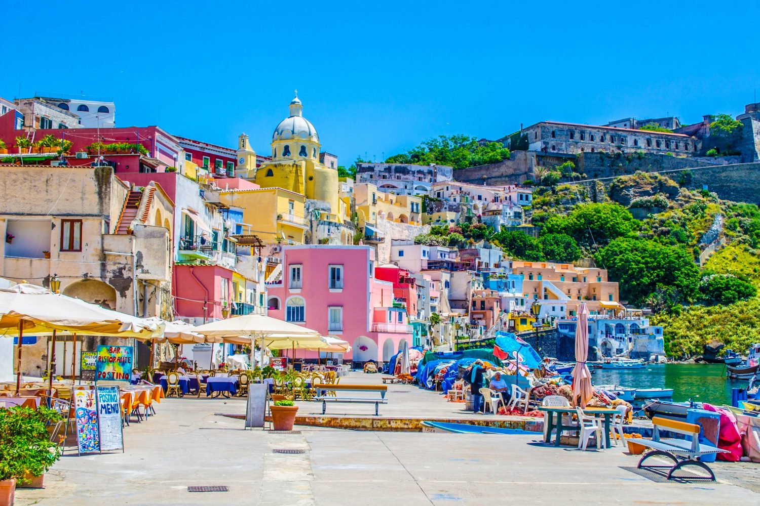 Nel Golfo di Napoli, assieme alle altre perle partenopee di Ischia e Capri, l’Isola di Procida, con una notevole densità umana, nonostante la superficie sia di appena 4 chilometri quadrati.